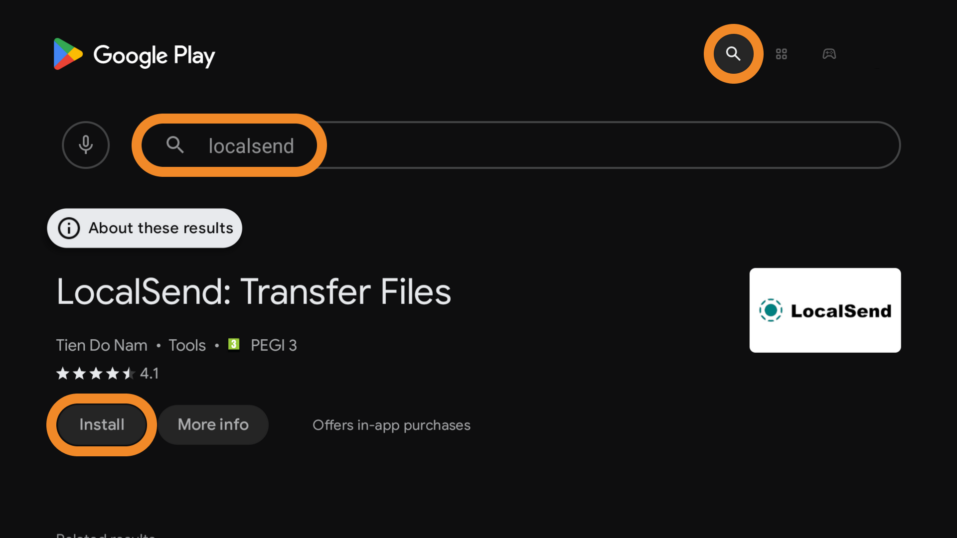 - Open Google Play on Android TV and go to Search. In the top-right corner, tap the 🔎 (magnifying glass) icon.