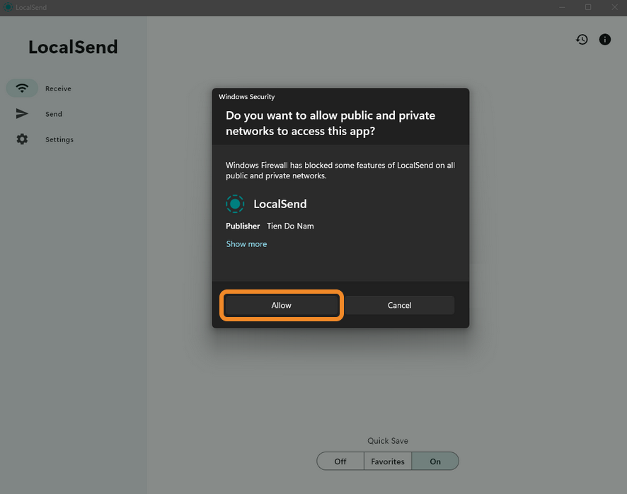 - Open LocalSend. If the system asks for local network access, allow it — otherwise you won’t be able to send data to Android TV.