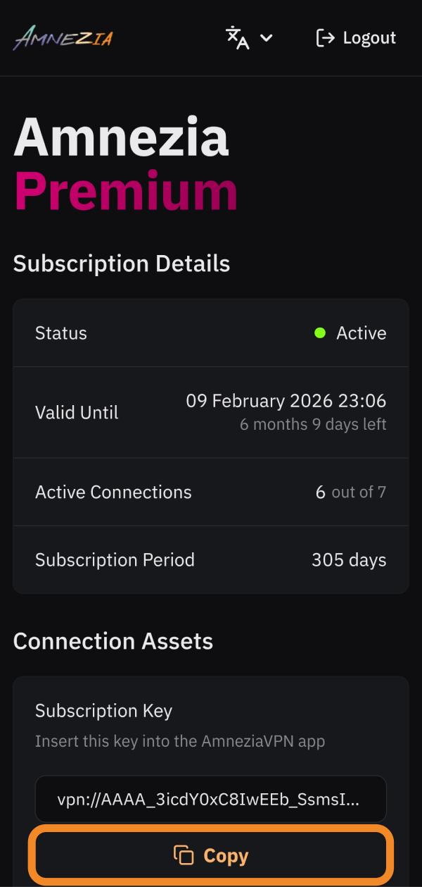 - On the second device, sign in to your Amnezia VPN account. If you’re already signed in, in Connection assets tap Copy next to the connection key — the key will be copied to the clipboard.
