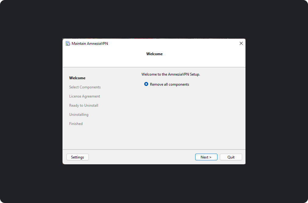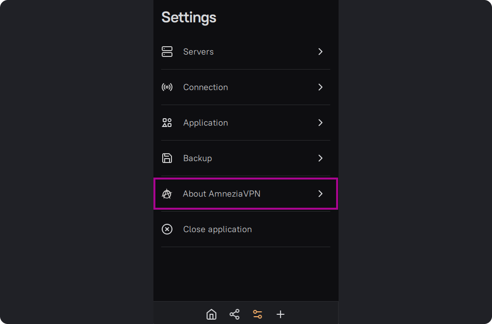 To update the application on Windows, you first need to download the new version to your device. To do this, open the application and go to the settings by finding the settings icon on the bottom panel. Select the section - "About Amnezia."