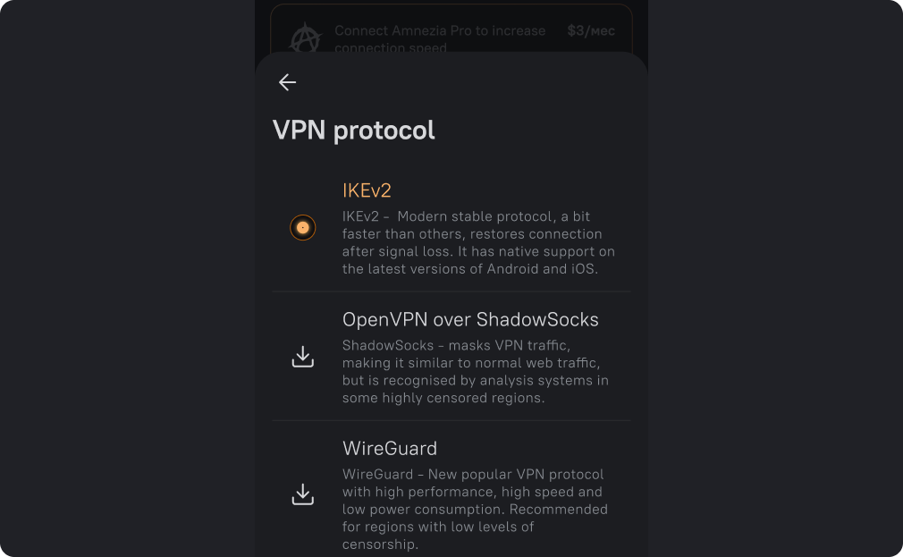 Amnezia supports almost all modern protocols: OpenVPN, Wireguard, ShadowSocks IKv2 and OpenVPN with Cloak plugin, you can read more about protocols in protocols description.