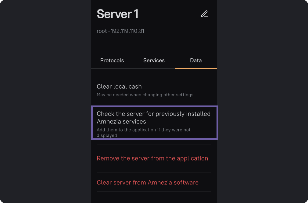 Select the "Data" tab. Select "Check server for installed Amnezia services".