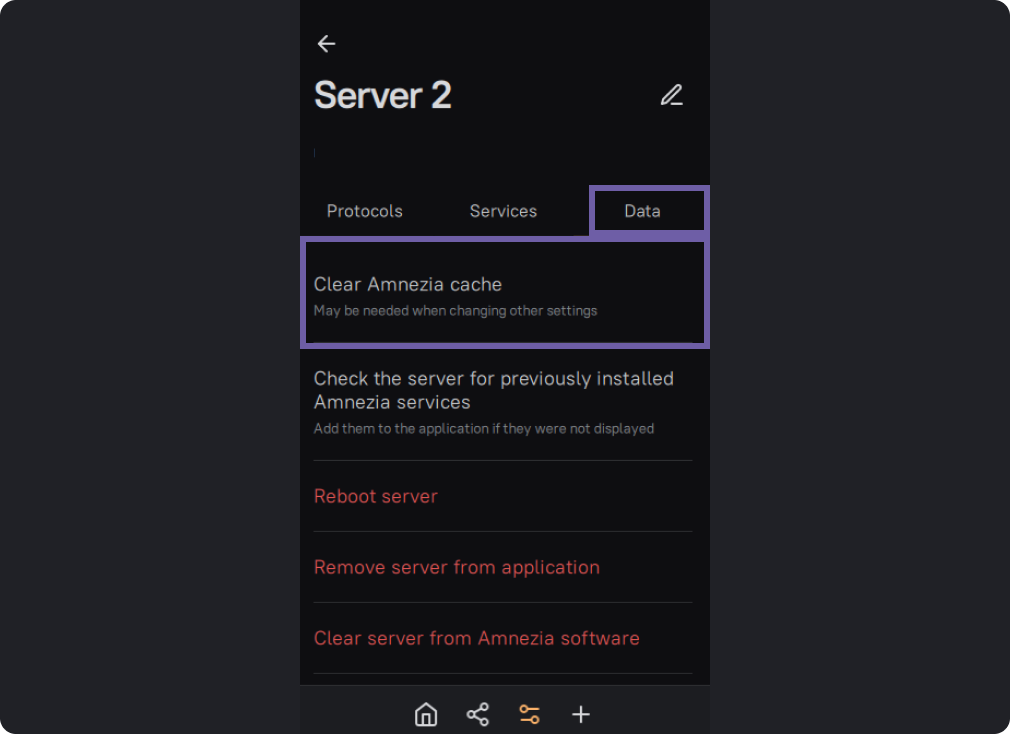 In the "Data" tab, select "Clear Amnezia cache".