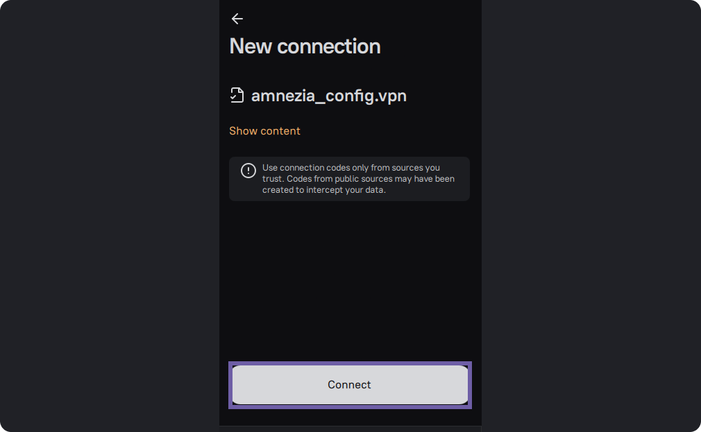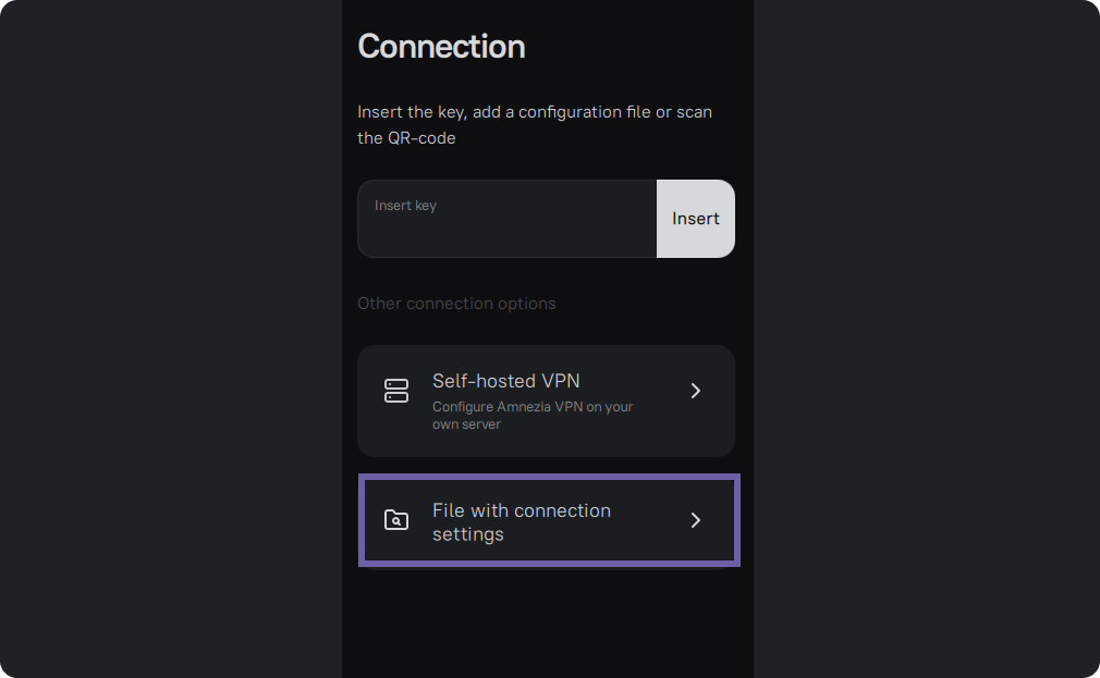 Amnezia supports files in the following formats: .json (protocols VLESS, VMESS, Reality), .conf, .ovpn, .vpn.