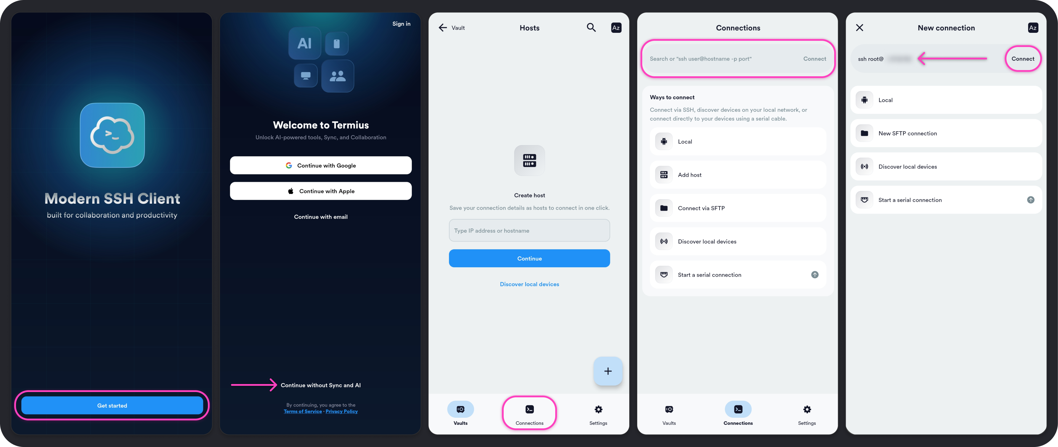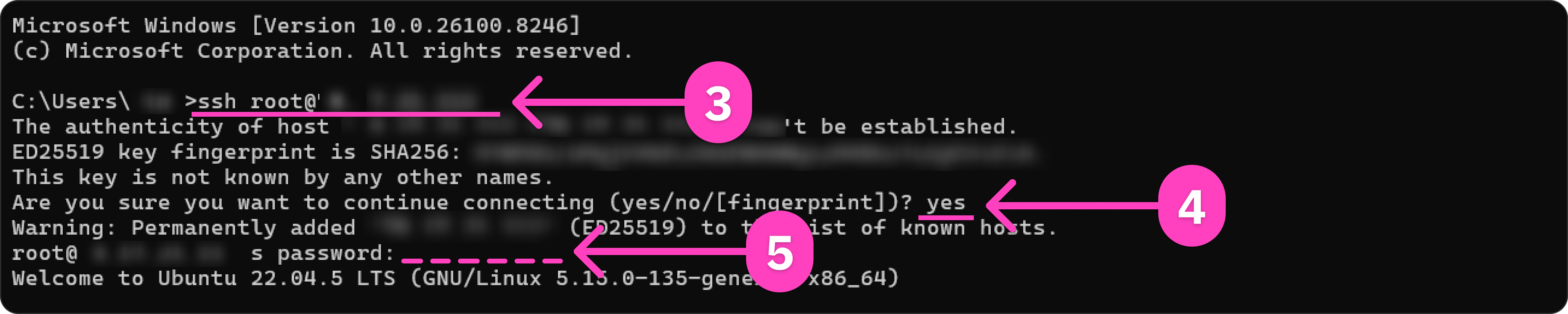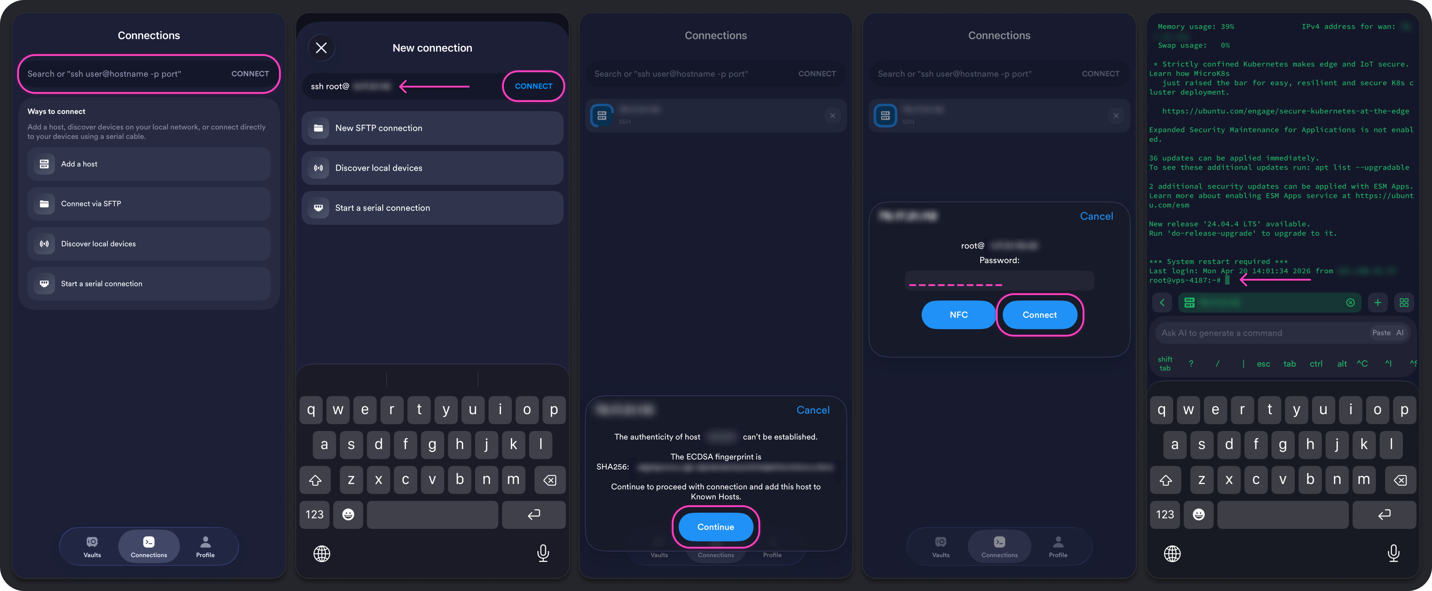 При первом подключении по SSH с устройства сервер попросит подтвердить fingerprint. Введите
