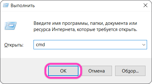 cmdи нажмите ОК — так вы войдёте в командную строку.