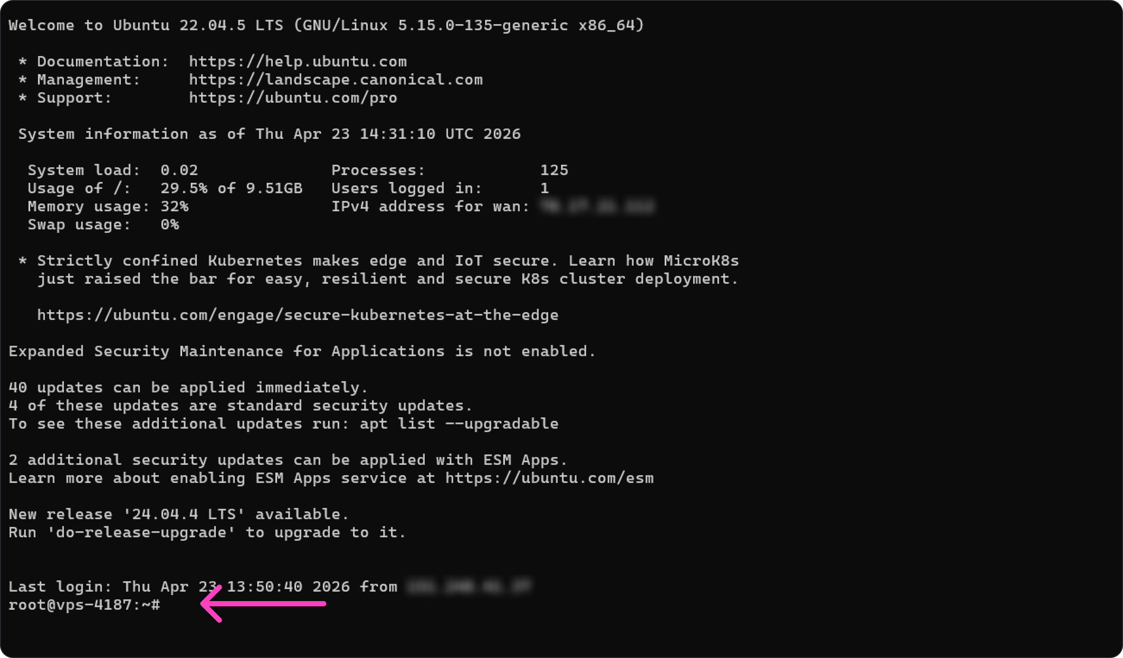 После успешного подключения откроется SSH-сессия. В примере ниже видно краткую информацию о сервере: операционную систему, использование диска и памяти, доступные обновления и т. д. В самом низу появится командная строка — отсюда мы можем управлять сервером с помощью команд.