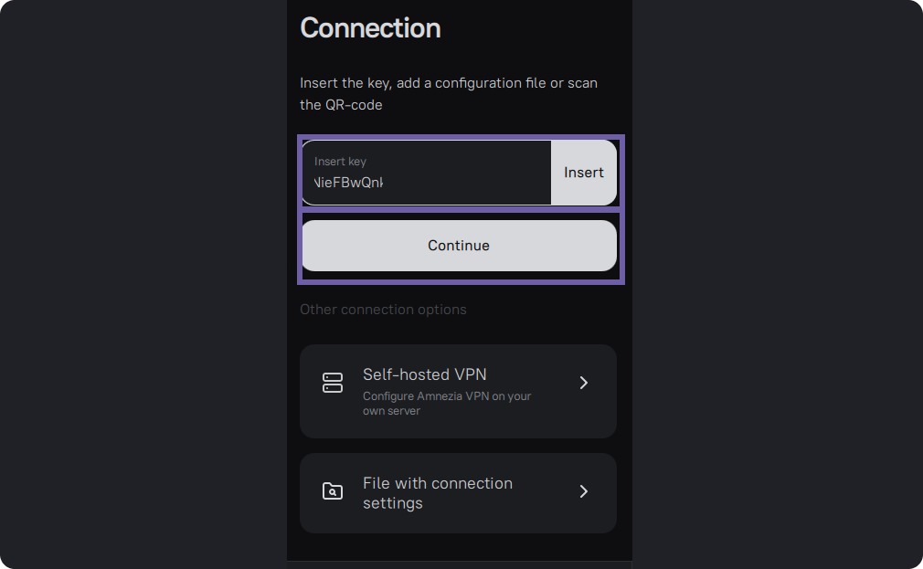 Copy the key from the source and paste it into the first input field. Amnezia supports keys in JSON formats (protocols ShadowSocks, VLESS, VMESS, Reality), as well as .conf, .ovpn, .vpn.