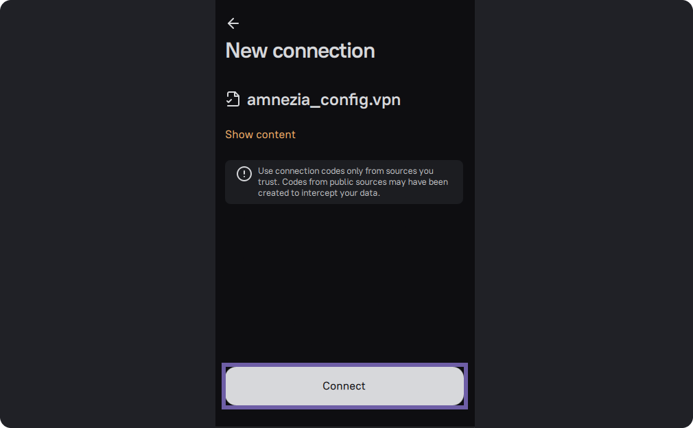On this screen, you can view the contents of the key by clicking "Show." Then click “Connect.”