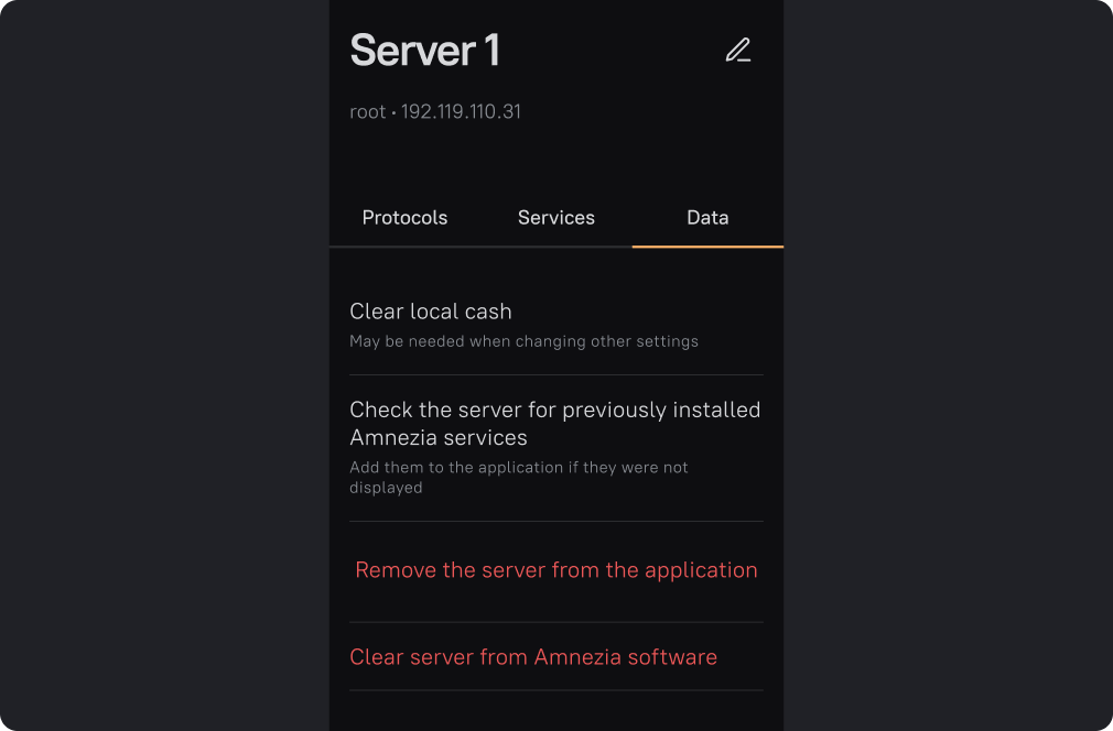 You may need to uninstall the server if you no longer want to connect to it. All installed Amnezia protocols and services will remain on the server. And will be available if you add the server to the application again.