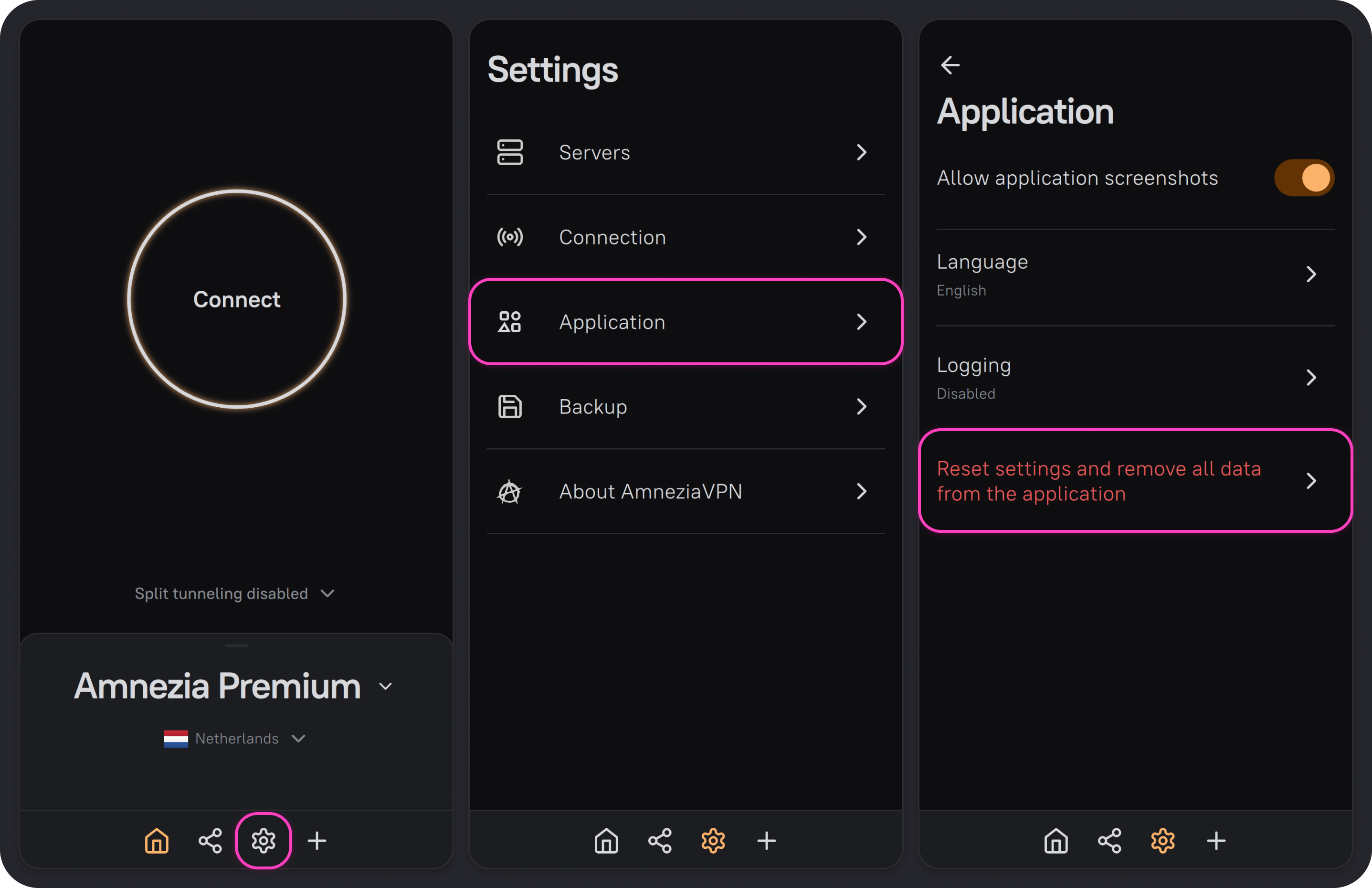 After the reset, you’ll need to add your connections again and set up AmneziaVPN (for example, configure Split Tunneling).