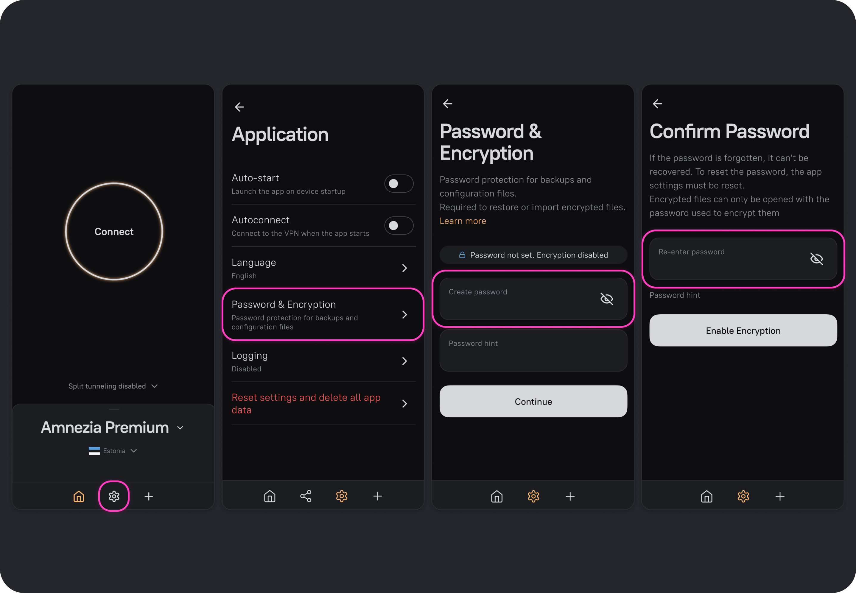 If you forgot the password, you won’t be able to access the contents of encrypted files. To disable encryption, you’ll need to reset all settings and delete all app data — this option is in AmneziaVPN settings under Application.