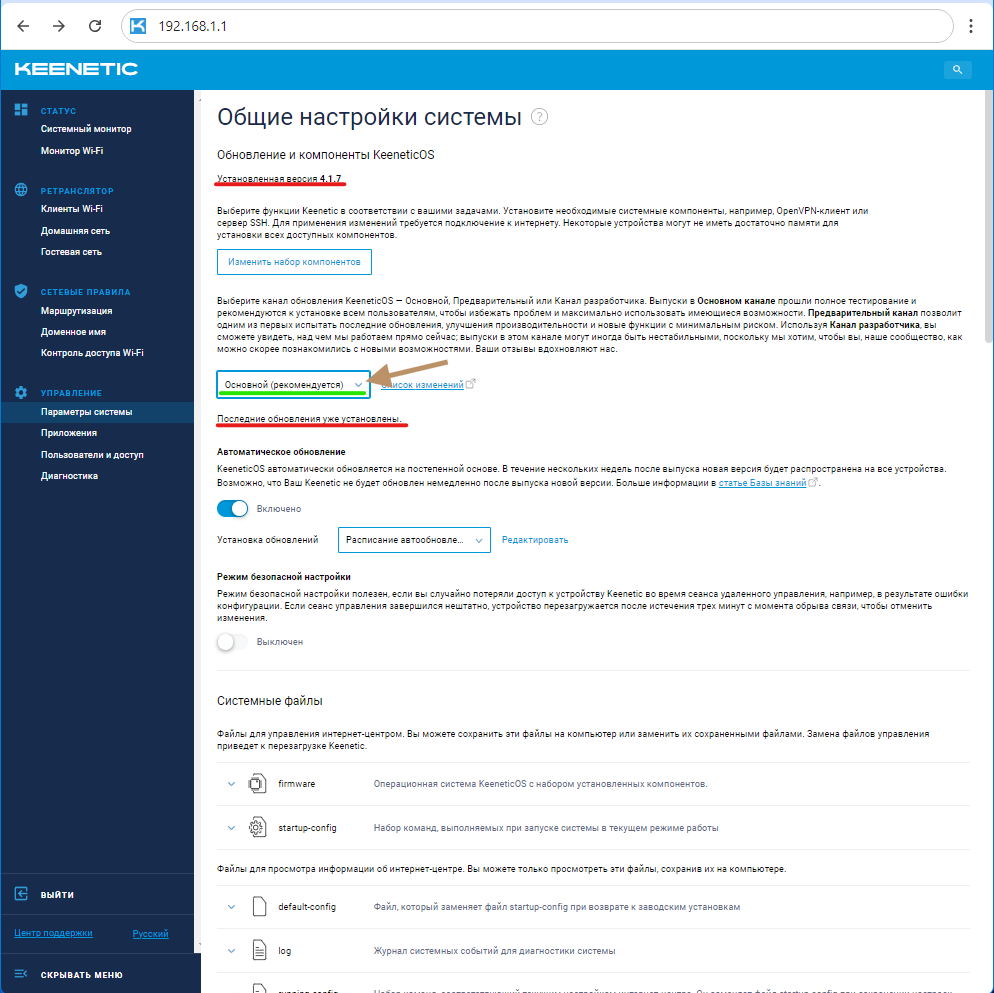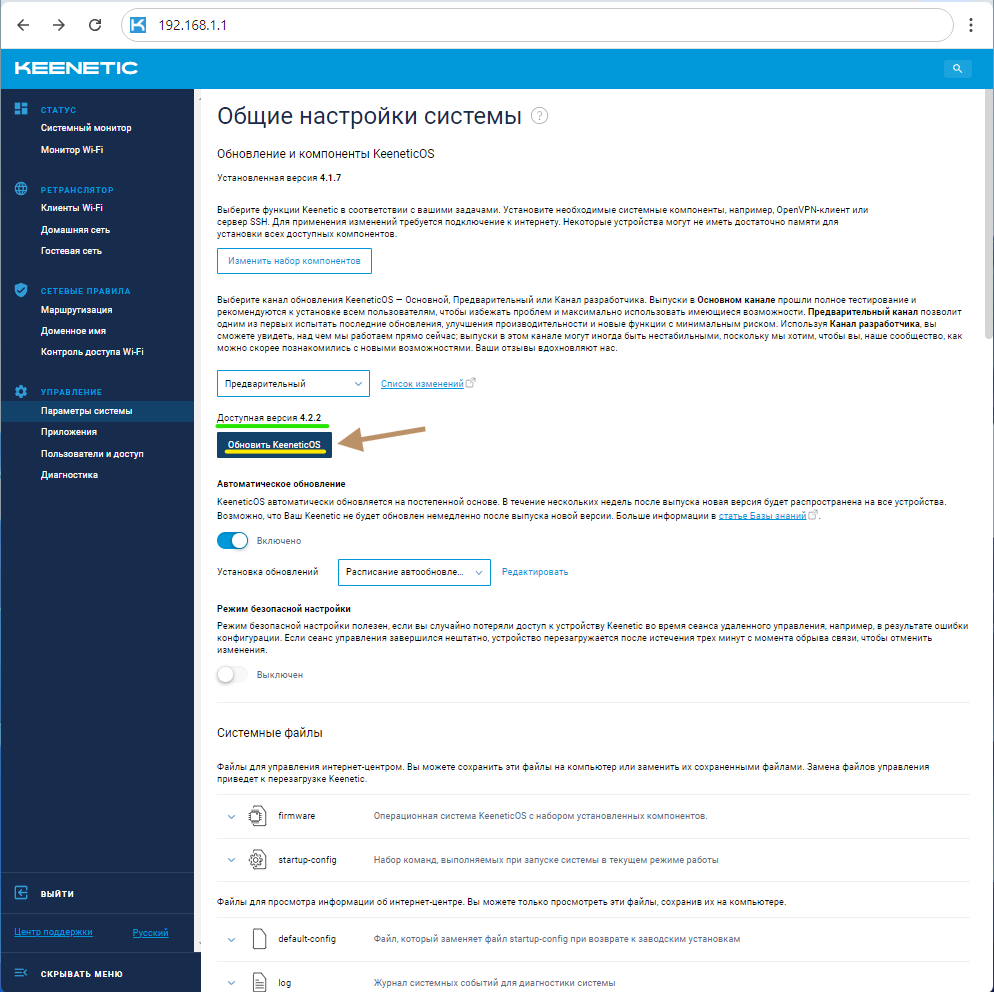После чего выполните обновление роутера до версии 4.2 или новее, нажав кнопку "Обновить KeeneticOS" на странице "Параметры системы". В процессе обновления роутер выполнит перезагрузку.
