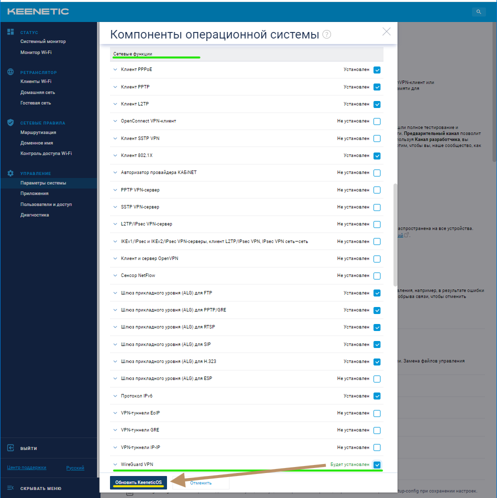 На открывшейся странице "Компоненты операционной системы", в секции "Сетевые функции", проверьте наличие установленного компонента "WireGuard VPN". Если компонент "WireGuard VPN" не установлен, отметьте соответствующий чек-бокс для установки и нажмите появившуюся снизу кнопку "Обновить KeeneticOS". Дождитесь, пока роутер обновится и перезагрузится.
