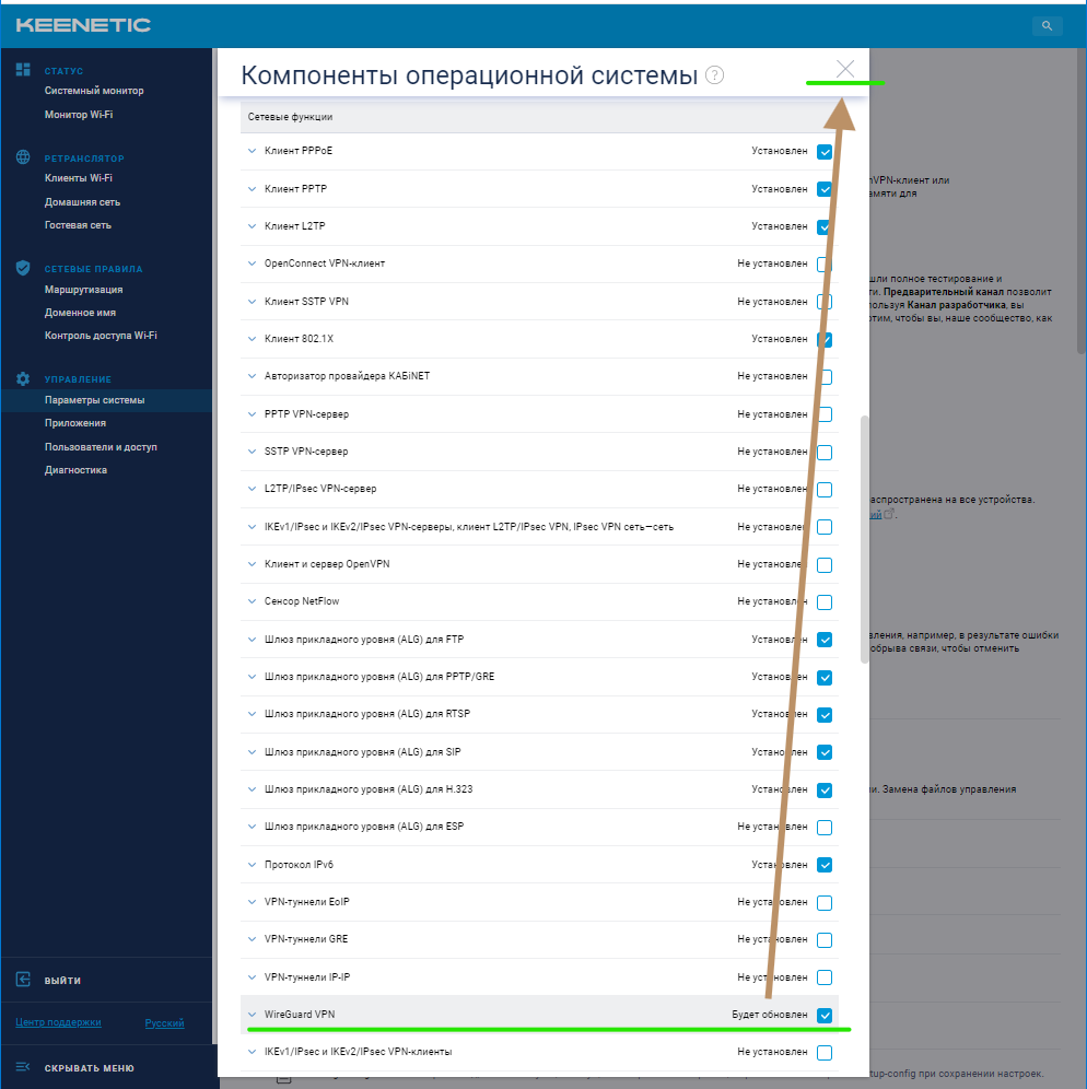 Если компонент "WireGuard VPN" уже установлен, но нуждается в обновлении, закройте список компонентов, чтобы вернуться на страницу "Параметры системы".