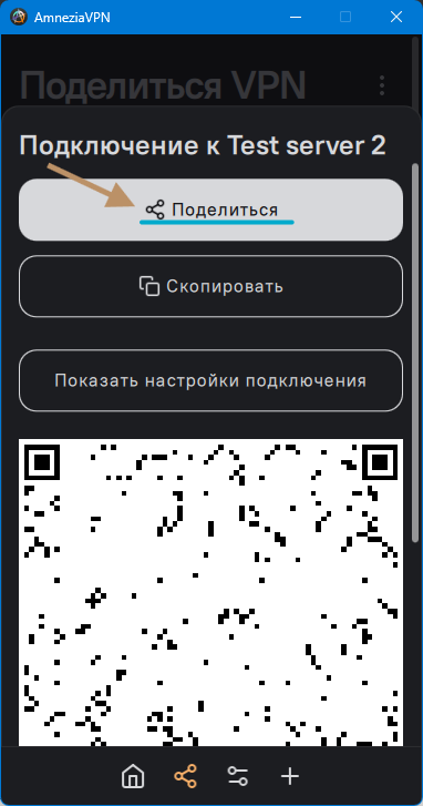 После генерации нового подключения AmneziaWG нужно сохранить его в виде файла. Для этого на следующем отобразившемся экране AmneziaVPN нажмите ещё одну кнопку "Поделиться", расположенную сверху.
