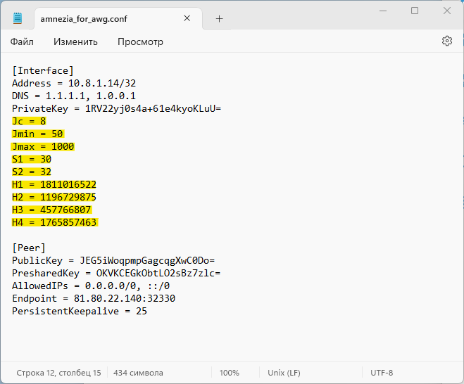 Теперь, зная имя интерфейса и значения параметров asc из файла в формате .conf, который мы сохранили ранее, нужно заменить все значения шаблона в скобках вашими значениями, а сами скобки удалить.
