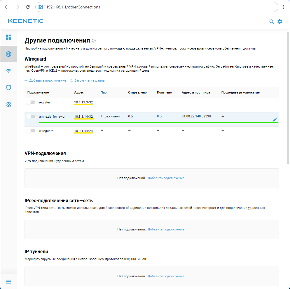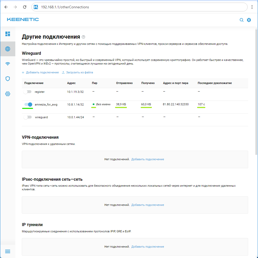 Теперь нужно перейти в раздел "Интернет", далее "Другие подключения", и проверить работоспособность созданного подключения WireGuard, переключив его состояние на "Включено". Через несколько секун д отметка активности пира должна изменить цвет с серого на зелёный. Также должна отобразиться информация о входящем/исходящем трафике и о времени с последнего "рукопожатия".