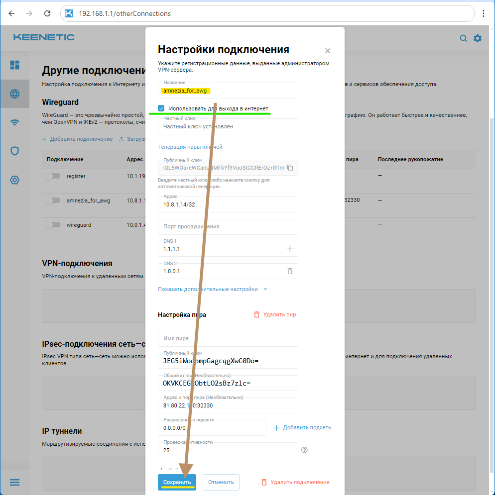 Далее для политики с названием VPN установите чек-бокс активности только на ранее созданном подключении (в данном примере amnezia_for_awg) и нажмите кнопку Сохранить внизу страницы.