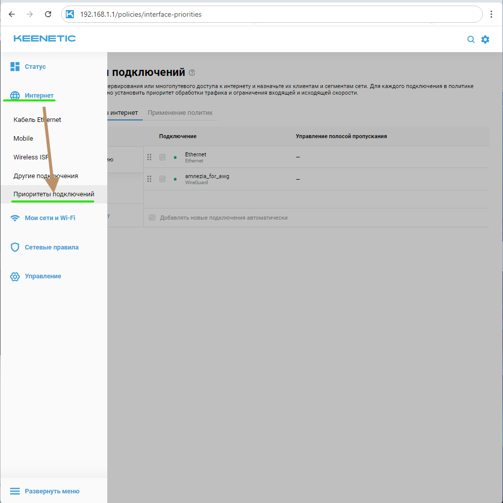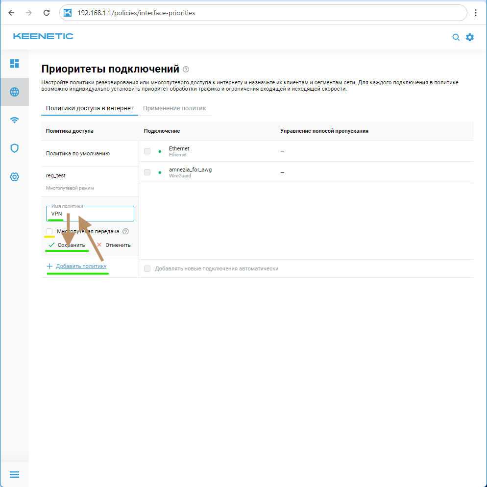 Если в политику VPN включить вторым по порядку подключение Ethernet, то при отключении amnezia_for_awg все устройства политики VPN будут переходить на использование основного интернет-подключения (в данном примере Ethernet). Это может быть удобно для переключения между разными соединениями без постоянного переноса устройств между разными политиками, однако это может вызывать утечки трафика через основное интернет-соединение.