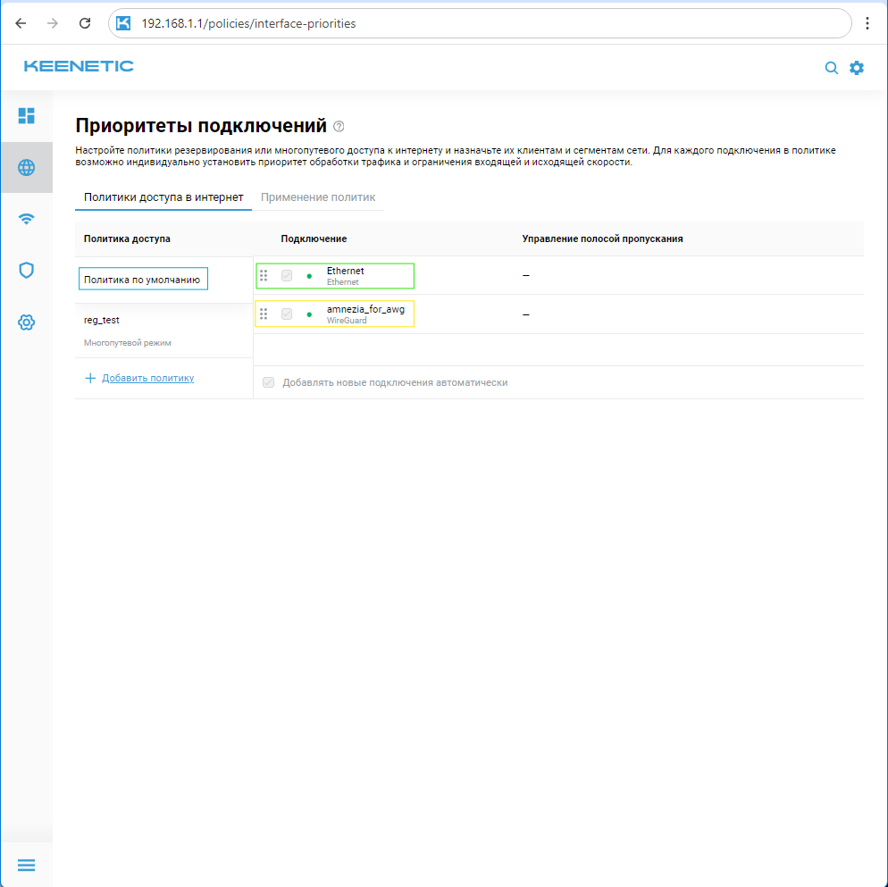 В настройках Политик доступа в Политике по умолчанию созданное VPN-подключение (amnezia_for_awg) должно идти ниже вашего основного интернет-подключения, чтобы избежать проблем с переподключением роутера при обрыве основного интернет-соединения.