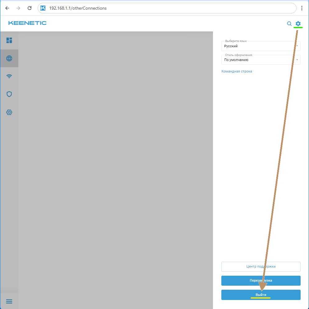 Теперь вы можете выйти из настроек роутера. Нажмите на шестерню в правом верхнем углу страницы, а затем нажа ть кнопку Выйти в правом нижнем углу страницы.