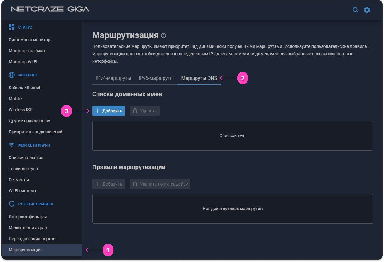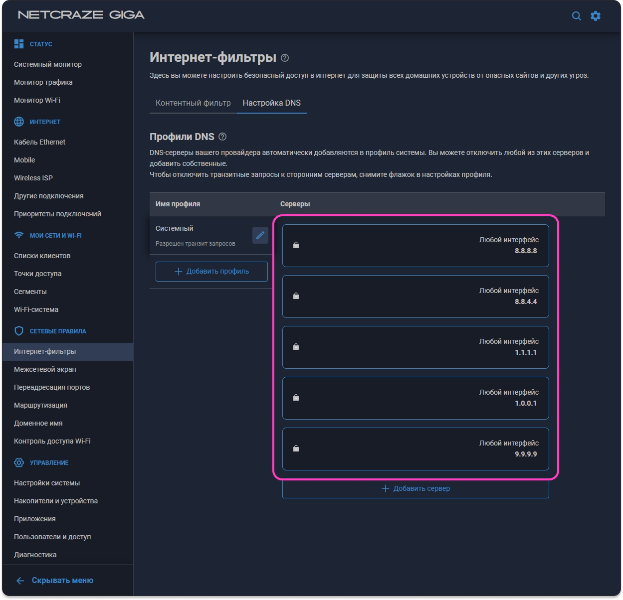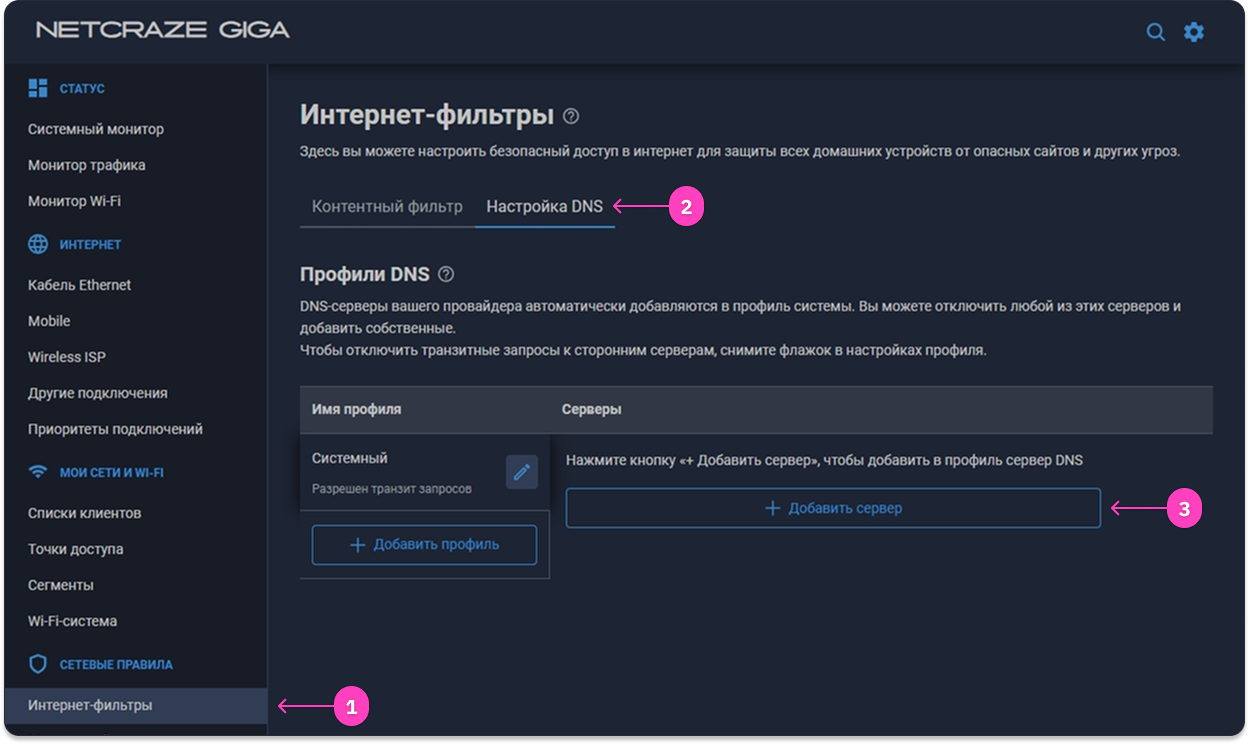 - Перейдите в Интернет-фильтры в разделе 🛡️ Сетевые правила, далее перейдите на вкладку Настройка DNS и нажмите Добавить сервер.
