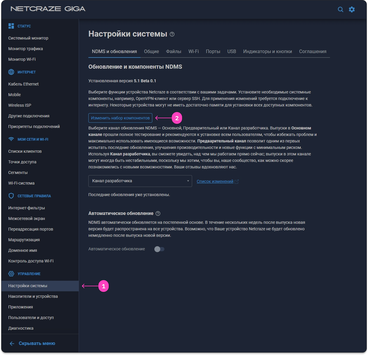 В случае перехода на получение обновлений NDMS через Канал разработчика рекомендуем отключить автоматическое обновление системы, чтобы новая dev-сборка не установилась автоматически, так как она может оказаться менее стабильной.