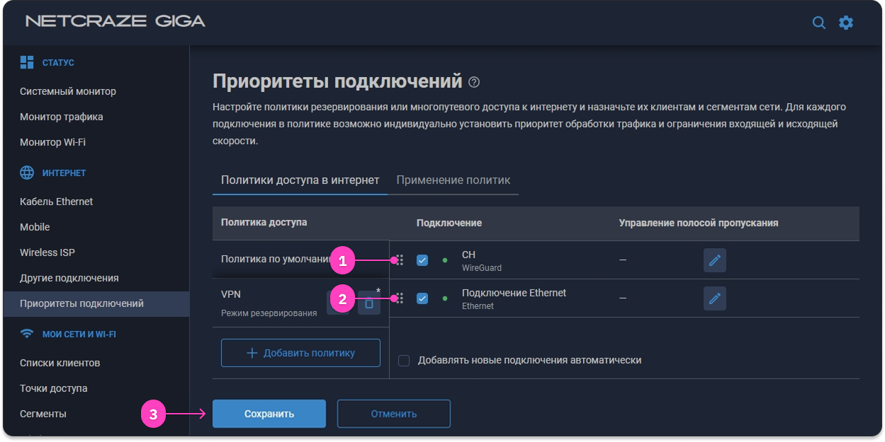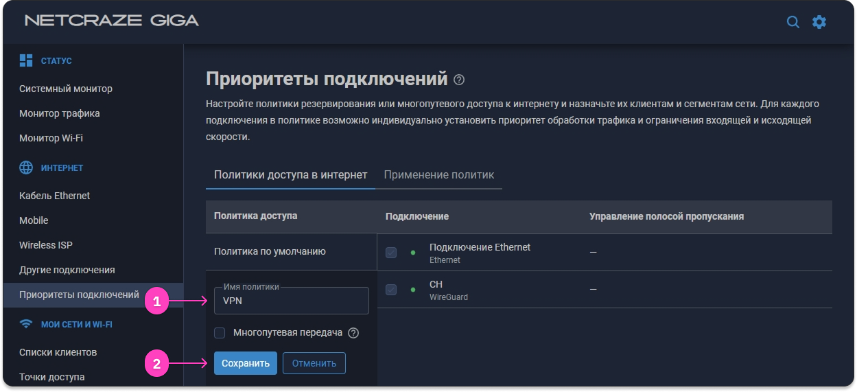 - Нажмите на созданную политику, поставьте галочку на WireGuard-подключение и нажмите Сохранить.