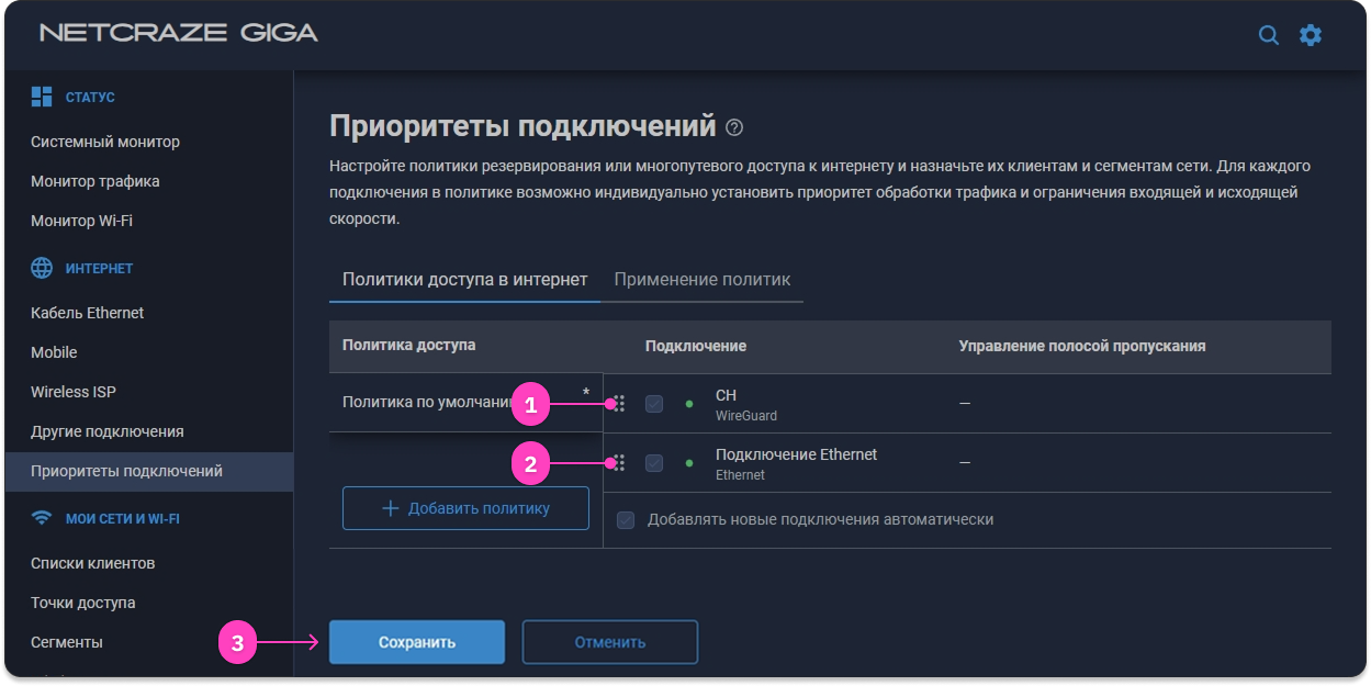 - Убедитесь, что в Политике по умолчанию ваше основное интернет-подключение находится выше WireGuard-подключения.