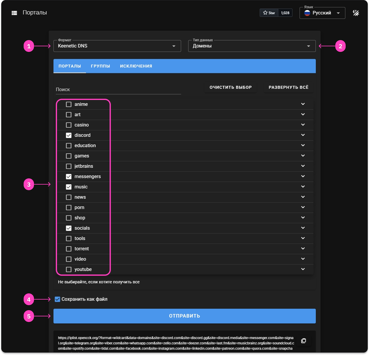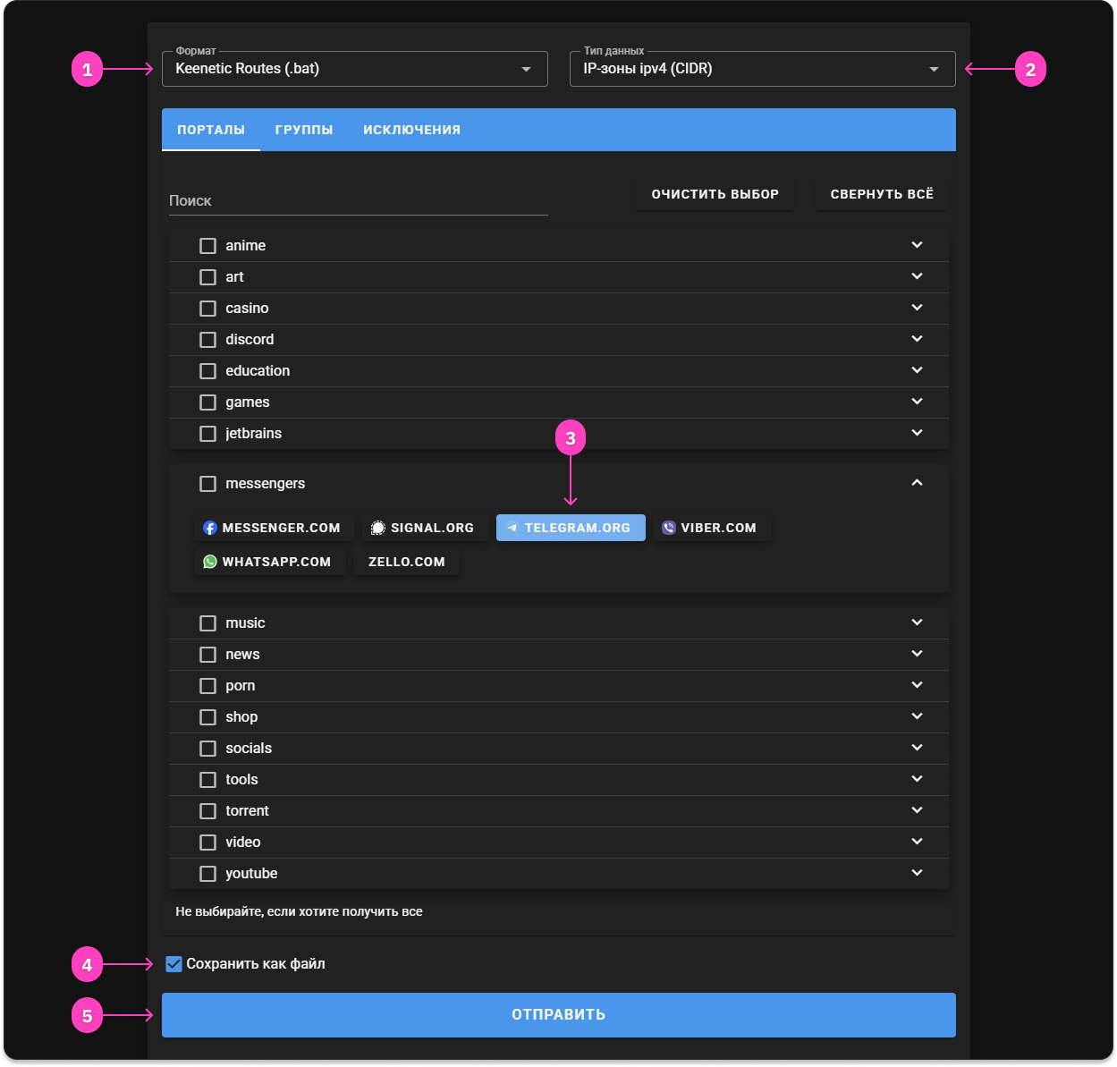 - комбинированный: через VPN только определённый список доменов и IP-подсетей
