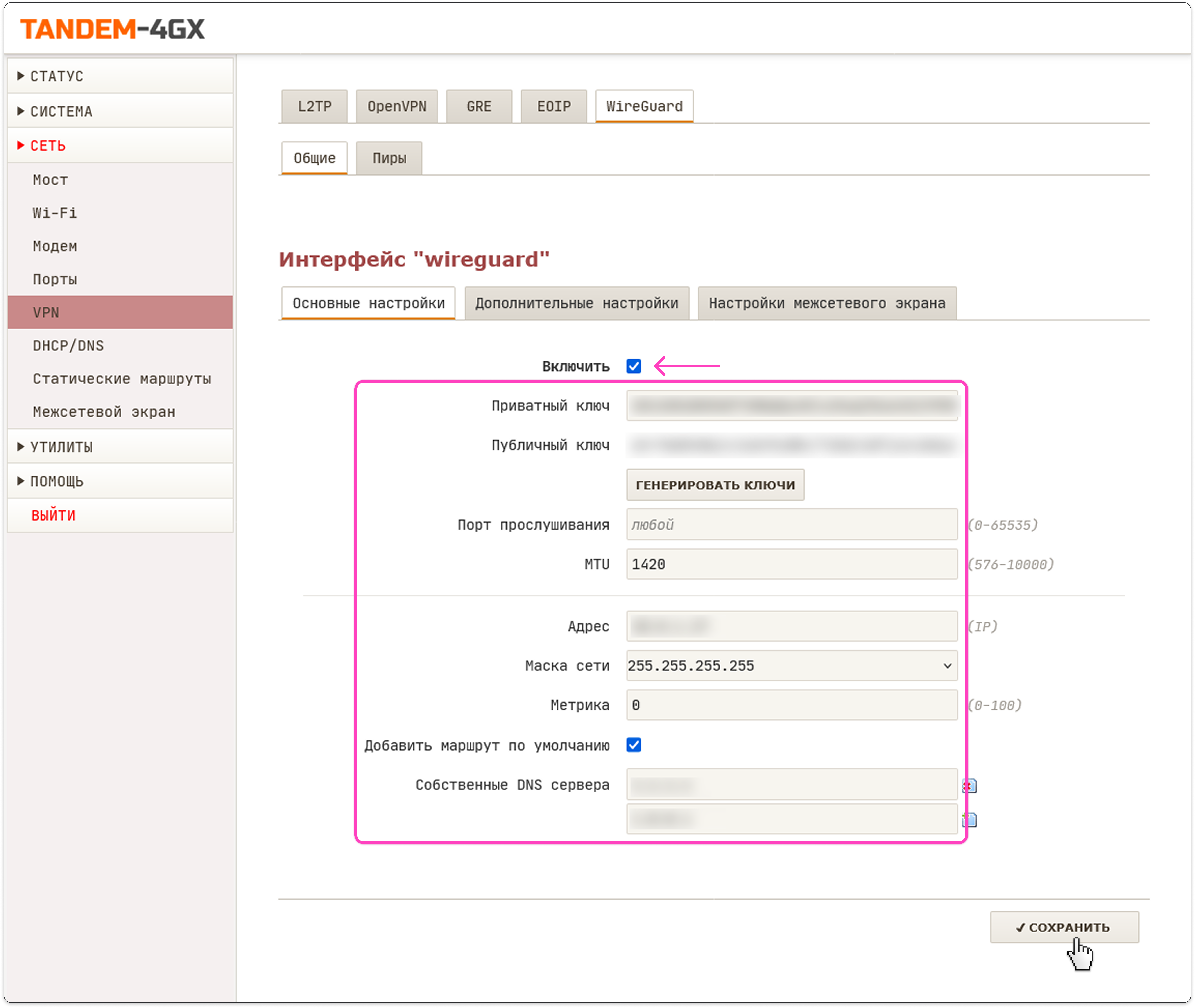 - Адрес и порт пира — заполните значением параметра Endpoint из файла конфигурации