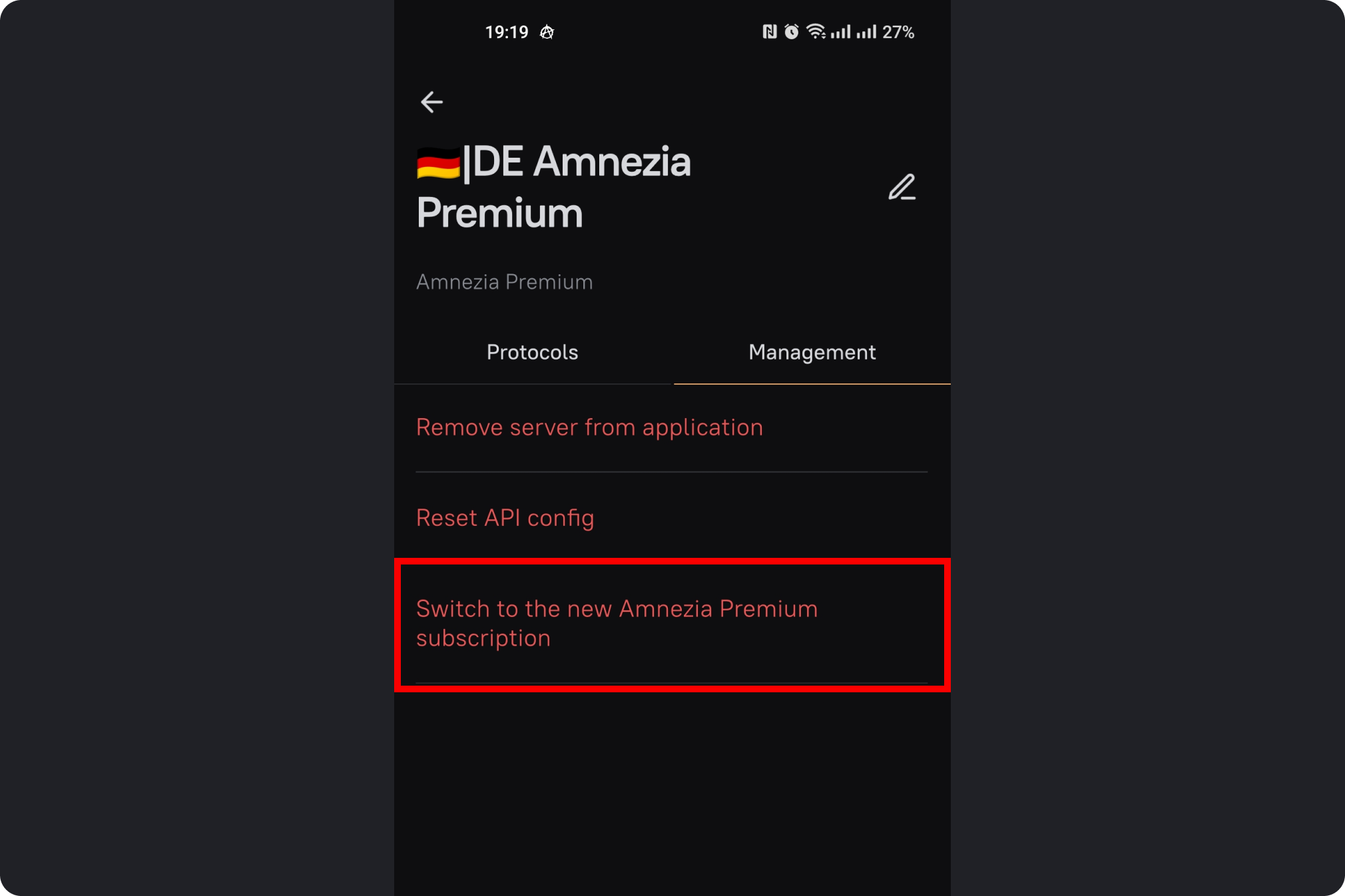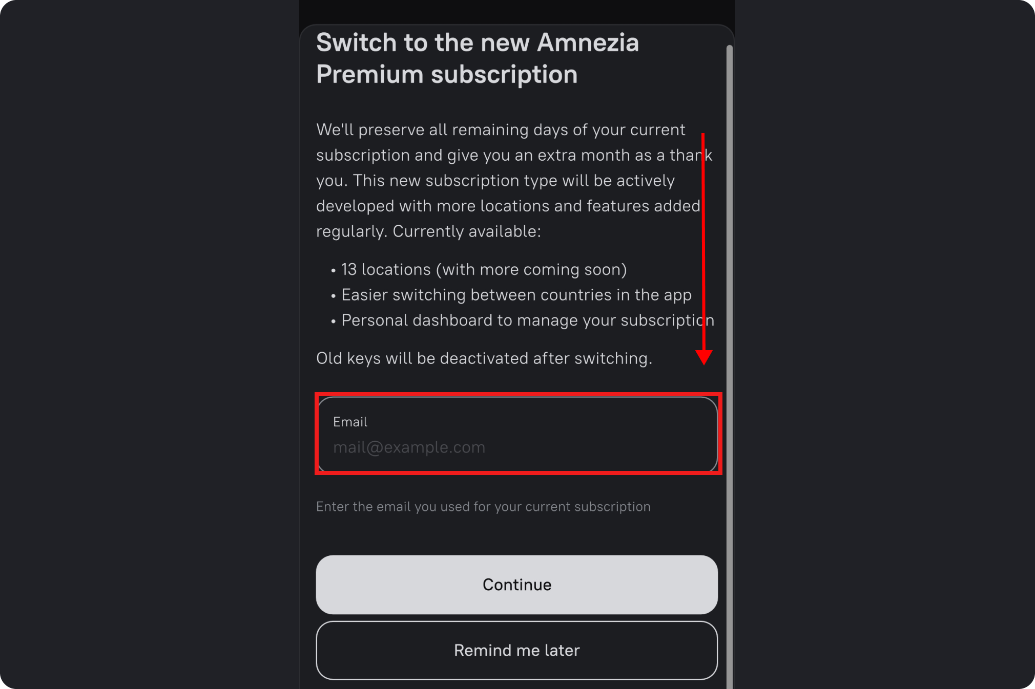 - If you see the error message «Unfortunately, you're using an older type of Amnezia VPN subscription», it means you can upgrade to the new subscription. Follow the next steps.