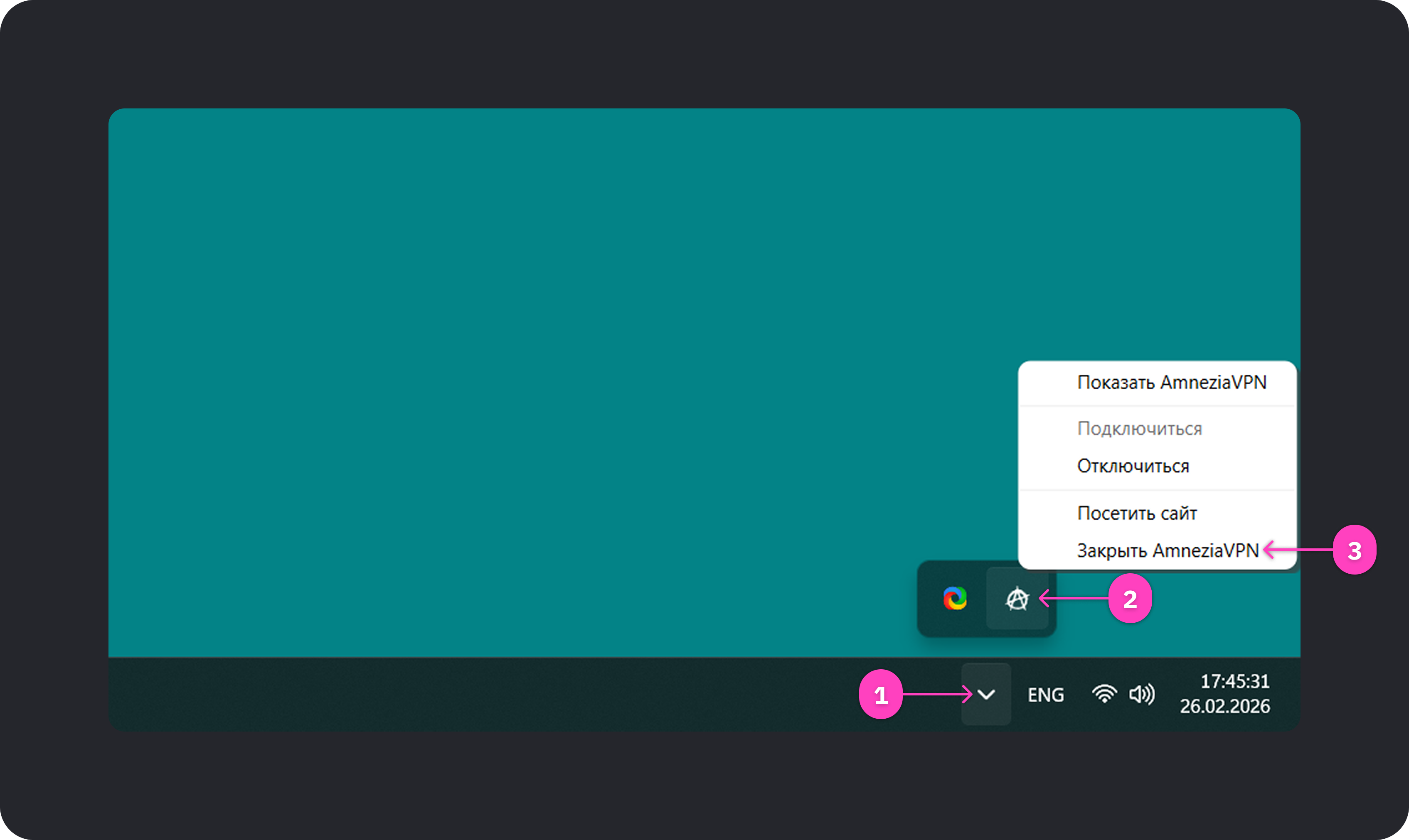 - Найдите в трее (правый нижний угол экрана) значок AmneziaVPN, нажмите на него правой кнопкой мыши и нажмите Закрыть AmneziaVPN.