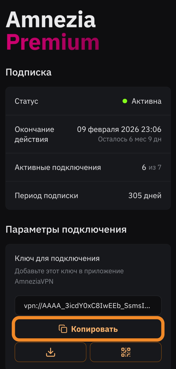 Скопируйте ключ vpn:// из веб-версии личного кабинета или из письма с деталями заказа, которое вы получили после оплаты Premium-подписки.