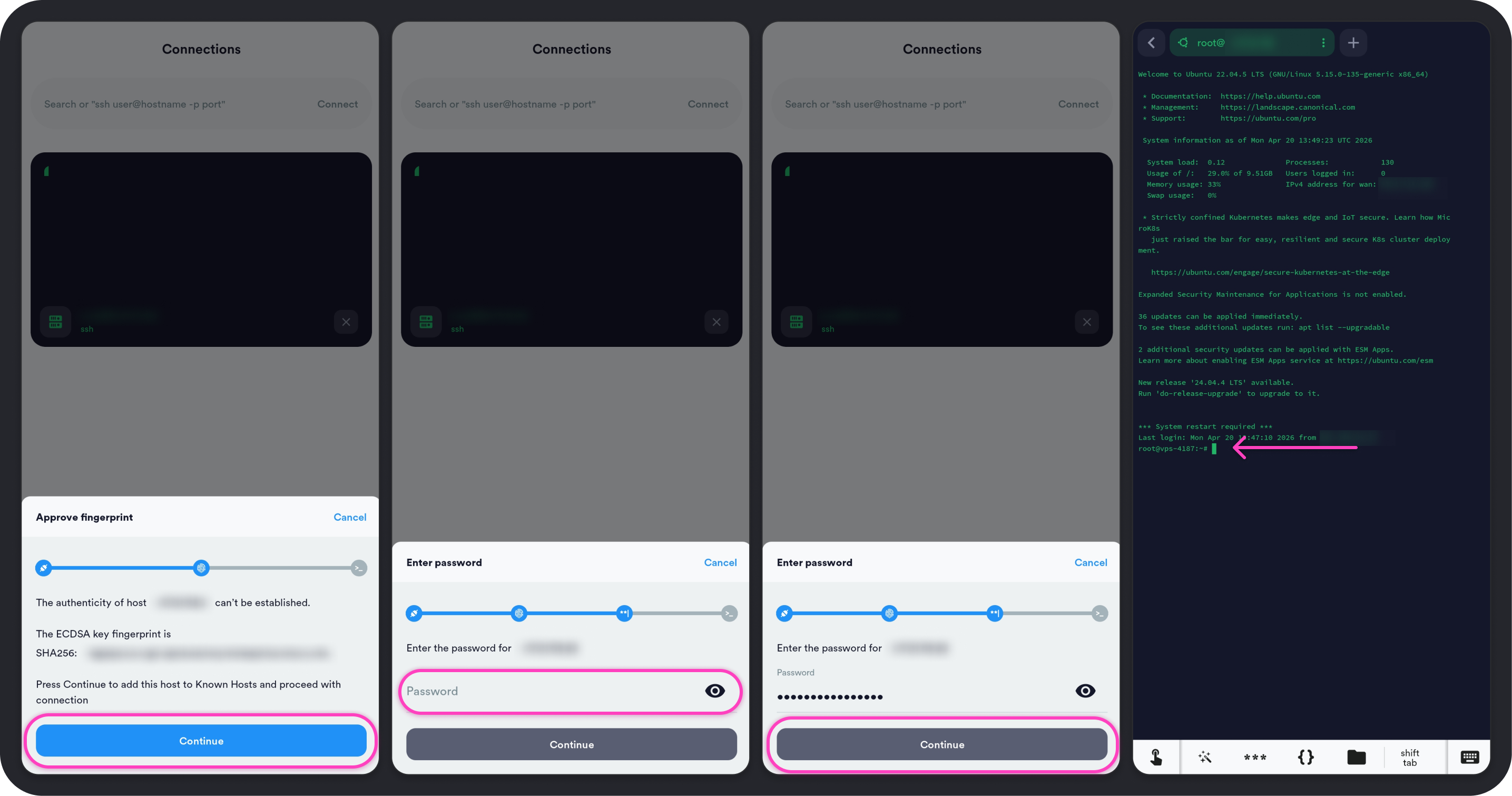 1. При первом подключении по SSH с устройства потребуется подтвердить fingerprint, нажмите Continue.