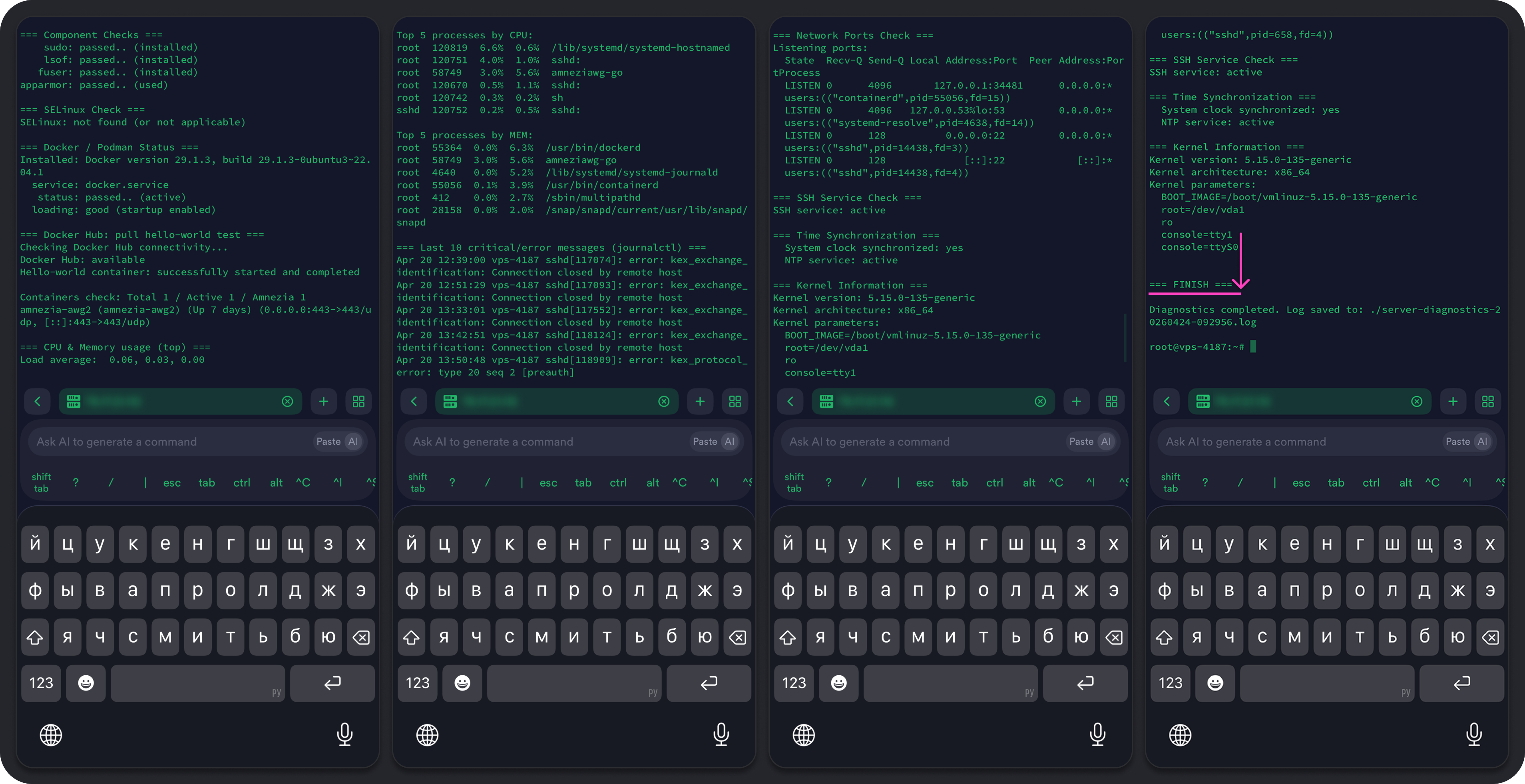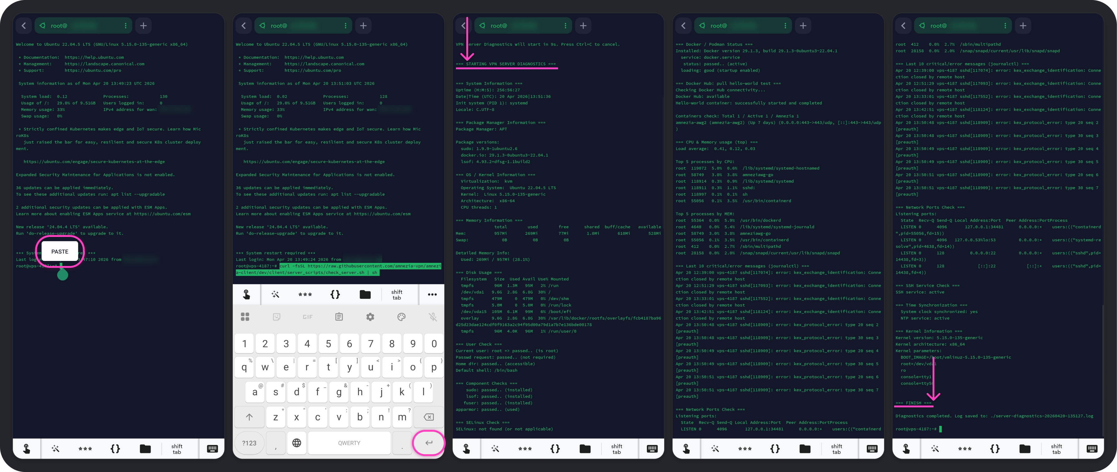 1. После выполнения диагностики отобразится результат. Чтобы поделиться данными с технической поддержкой для проверки работы сервера, скопируйте текст от строки === STARTING VPN DIAGNOSTICS === до строки === FINISH === — эти места обозначены на скриншотах ниже.