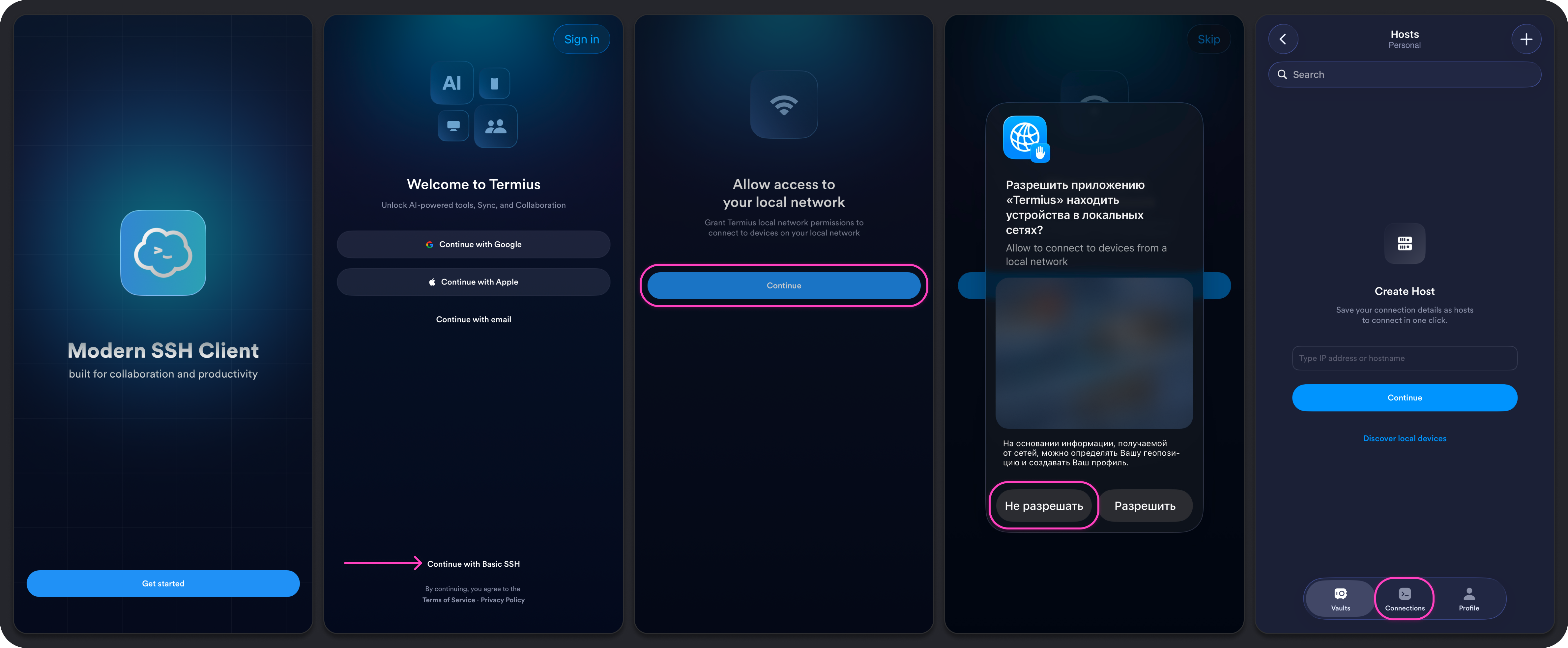 3. На экране Allow access to your local network нажмите Continue. Далее приложение запросит доступ к вашей локальной сети, мы рекомендуем его не давать. Нажмите "Не разрешать".