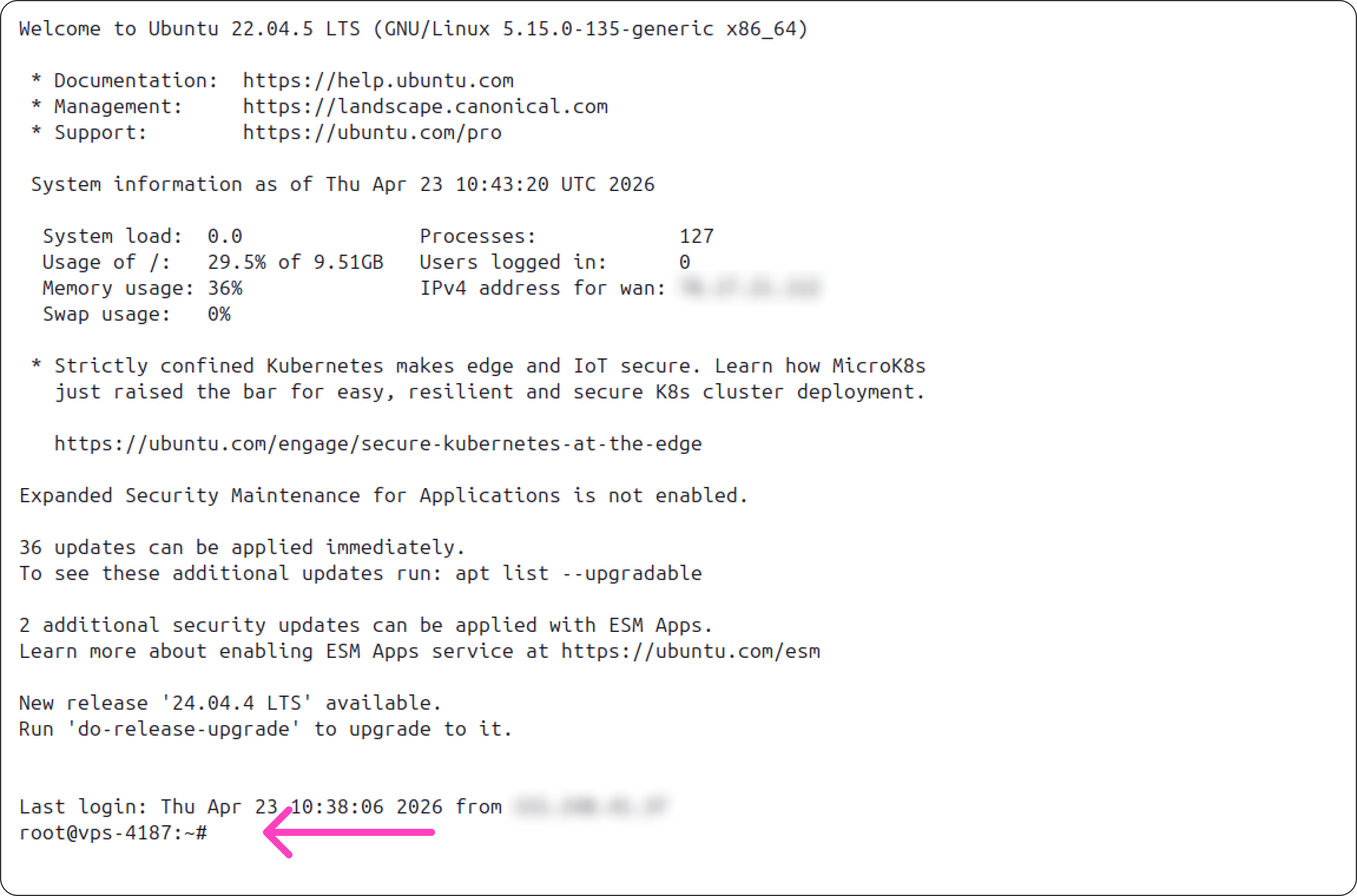 После успешного подключения откроется SSH-сессия. В примере ниже видно краткую информацию о сервере: использование диска и памяти, доступные обновления и т. д. В самом низу появится командная строка — отсюда мы можем управлять сервером с помощью команд.