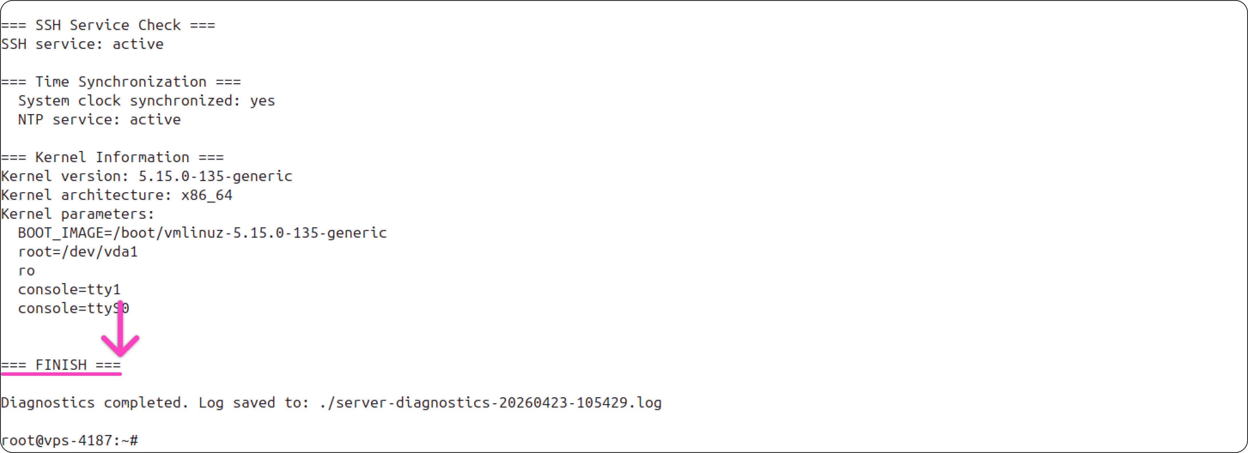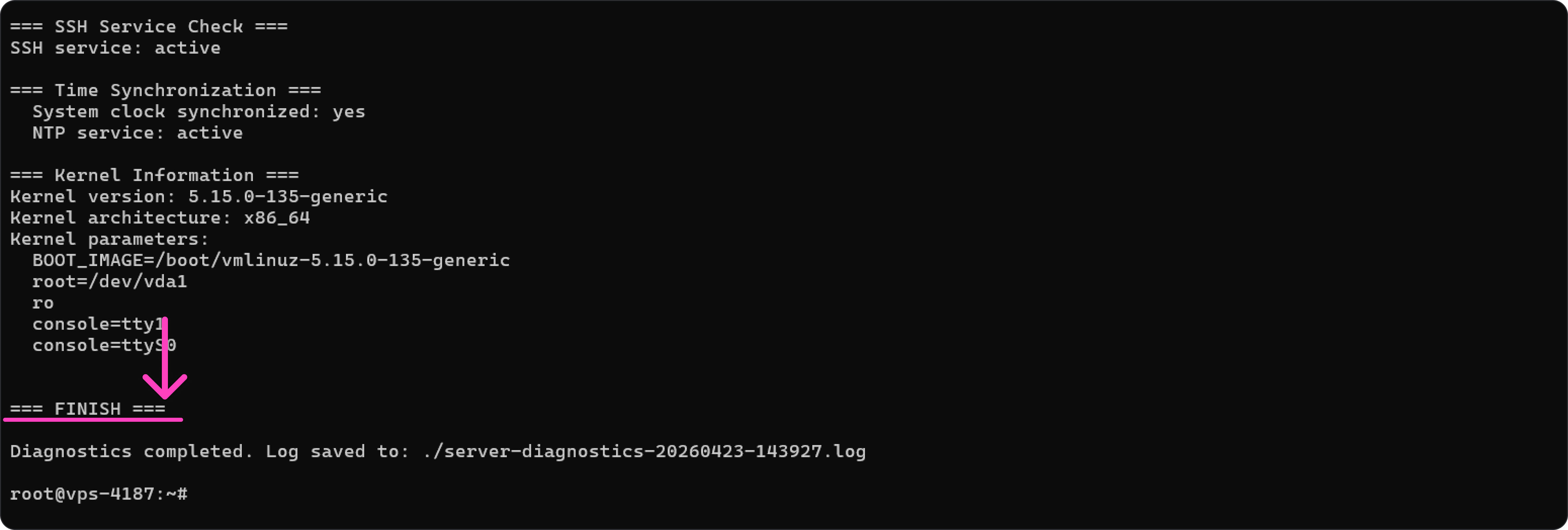 Указанная ниже команда выполняет комплексную проверку системы и выводит детальный отчёт. С его помощью можно оценить состояние сервера и выявить распространённые проблемы, например нехватку места на диске.