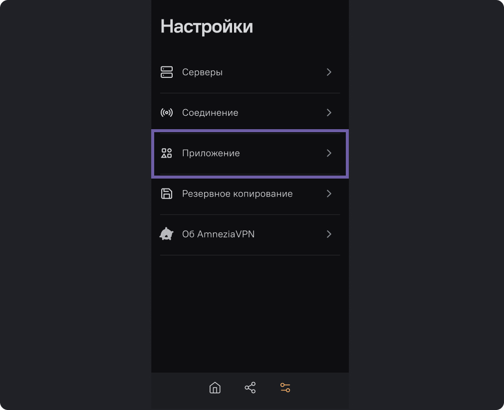 Далее перейдите в раздел настроек, выберете “Приложение”.