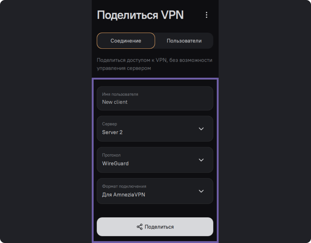 Поделиться подключением - это значит предоставить доступ к своему VPN другому пользователю. Можно предоставить полный доступ с возможностью вносить изменения на сервере, в таком случае, тот, с кем вы поделились, сможет устанавливать, удалять и настраивать протоколы и другие сервисы Amnezia. А можно предоставить доступ только для подключения, в этом случае пользователь, с которым вы поделились, сможет пользоваться вашим VPN, но не сможет менять его настройки и протоколы.