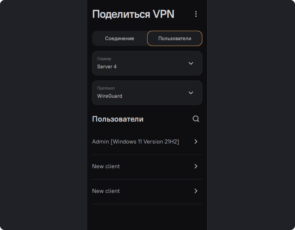 В меню “Пользователи” вы сможете посмотреть с кем вы делились подключением, а так же отозвать доступ к своему VPN.