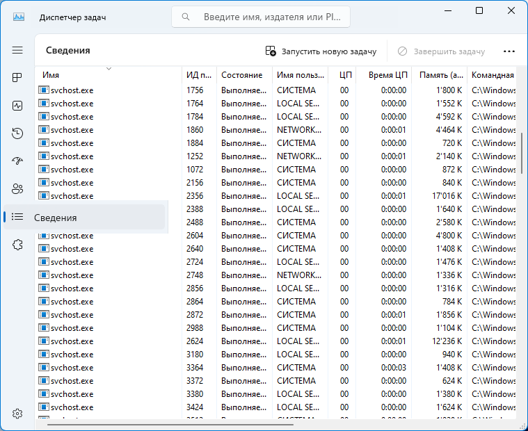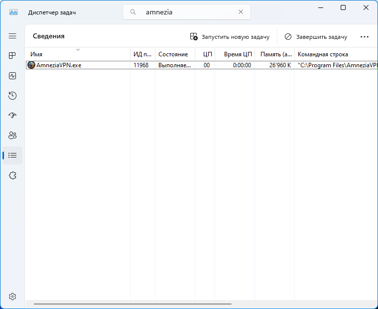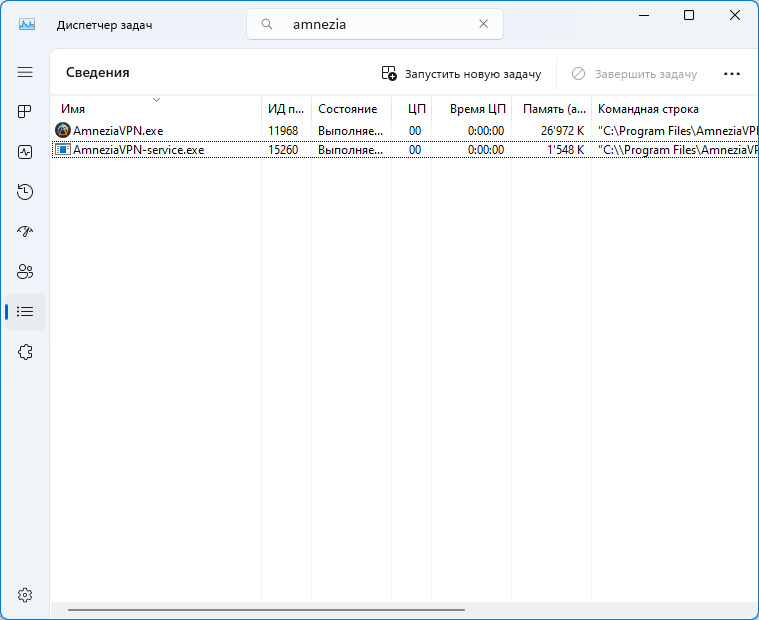 6. Если служба AmneziaVPN-service запущена (Состояние: Выполняется), а во вкладке Сведения, присутствует процесс AmneziaVPN-service.exe