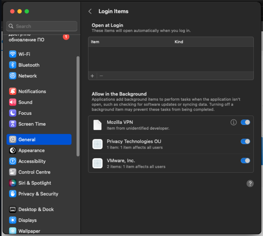 Для MacOS нужно предоставить разрешение для запуска службы Privacy Technologies OU в Login Items