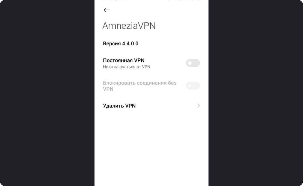 Если на устройстве помимо Amnezia установлены другие VPN - приложения, проблема может возникать из-за включенных дополнительных опций на Android, в этом случае запросы на добавление других профилей отклоняются по умолчанию и