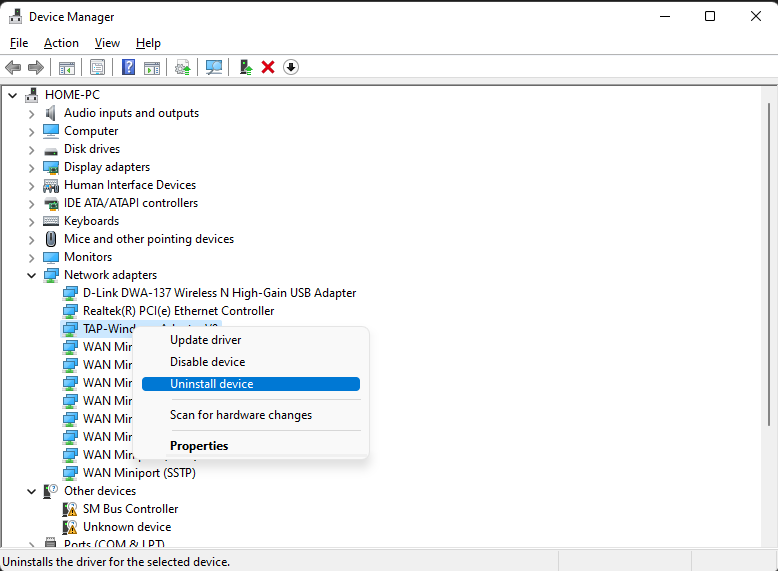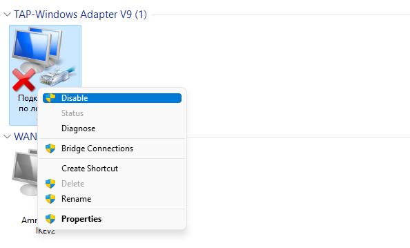 Go to "Network Adapters" and disable the TAP Adapter V9 adapter (created by Amnezia), then remove it. If there are several adapters, remove them all.